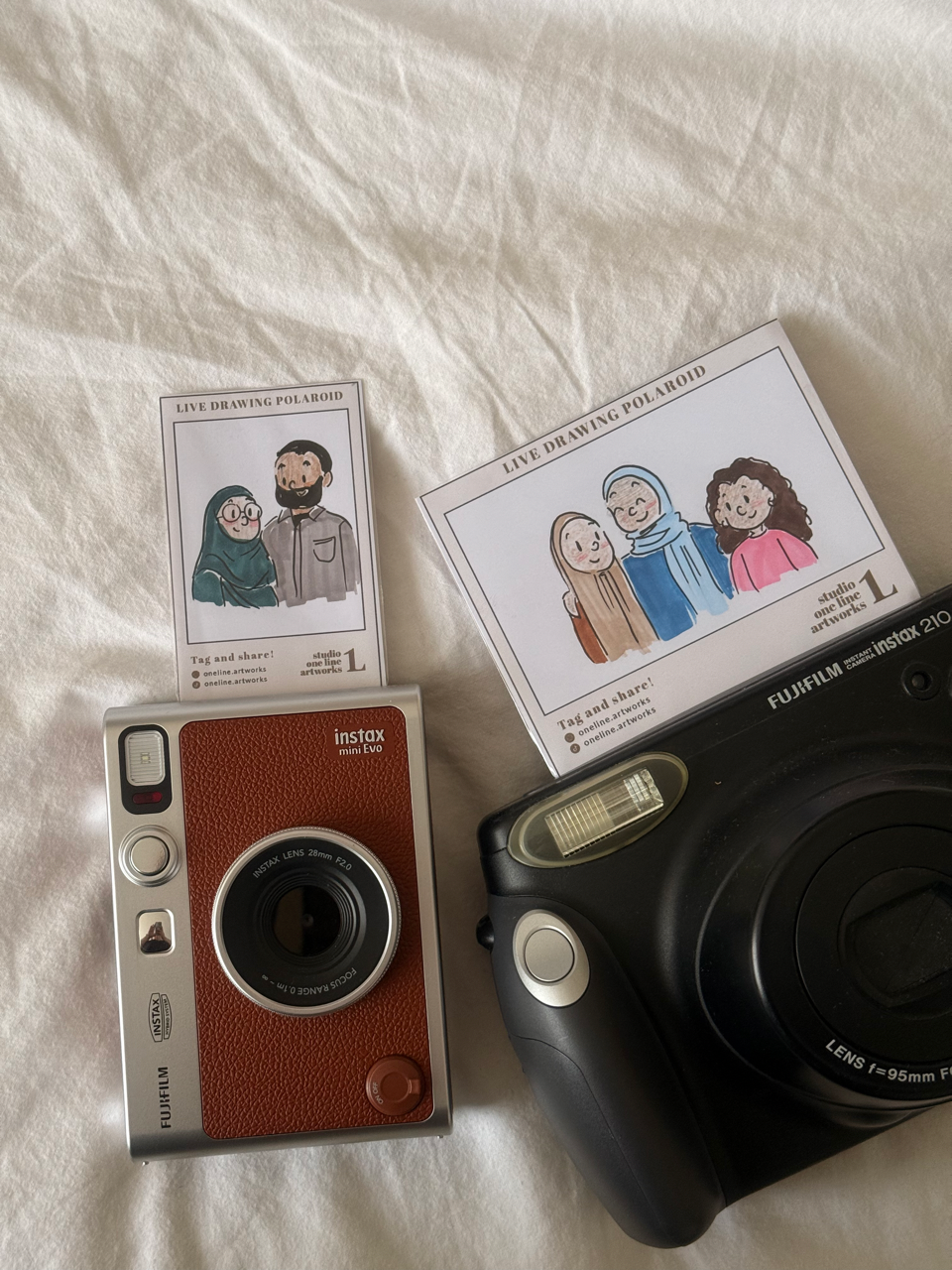 Each illustration is hand‑drawn in a clean, minimal style. The well‑known polaroid layout is one of the favourites, but every design can be customised to suit your event’s theme, palette or atmosphere.