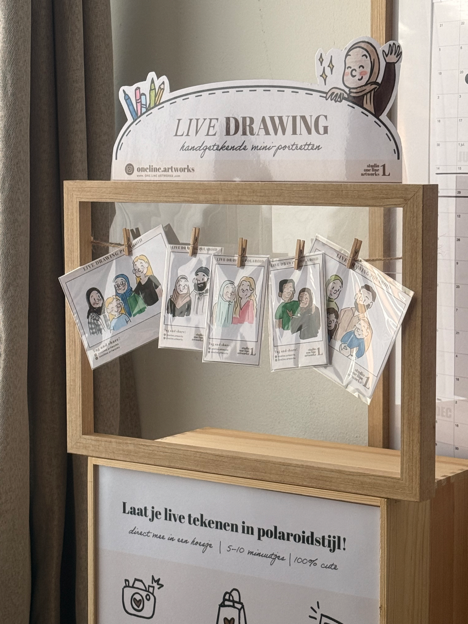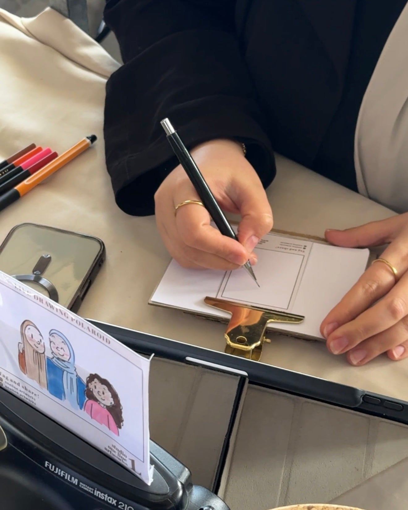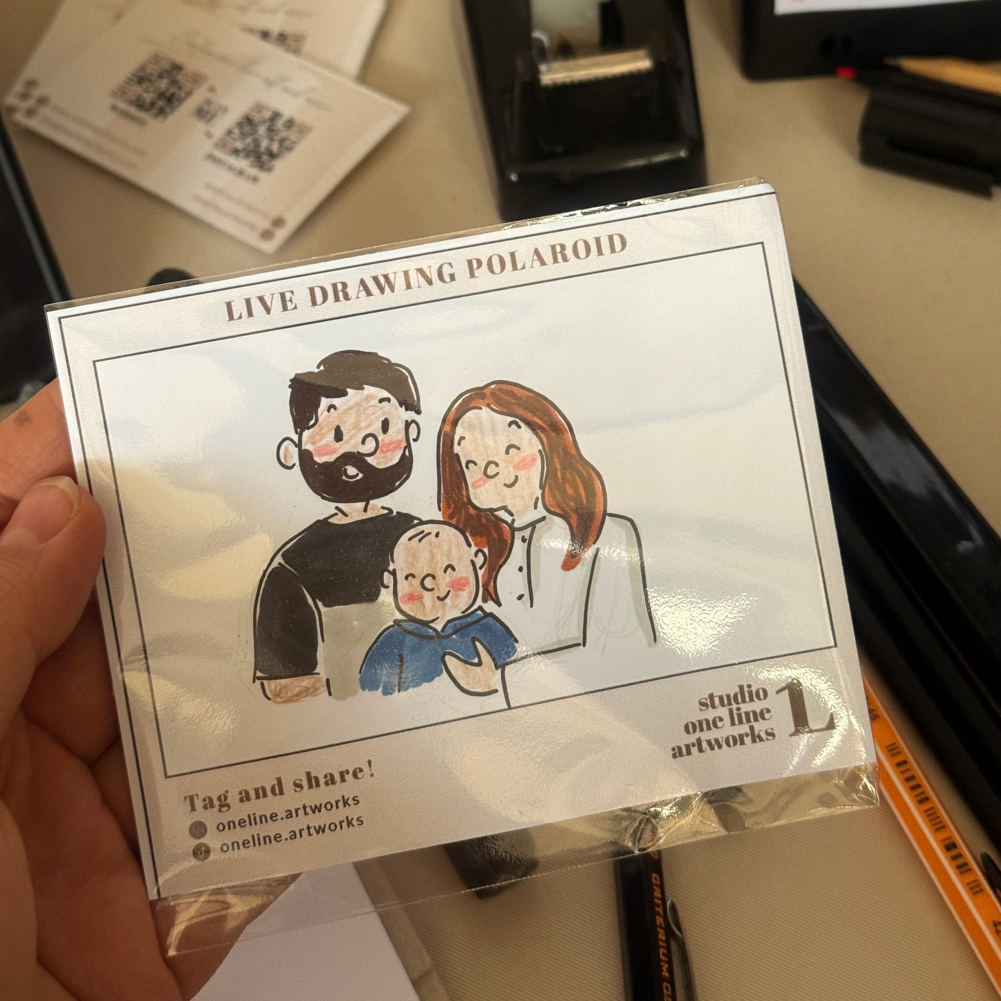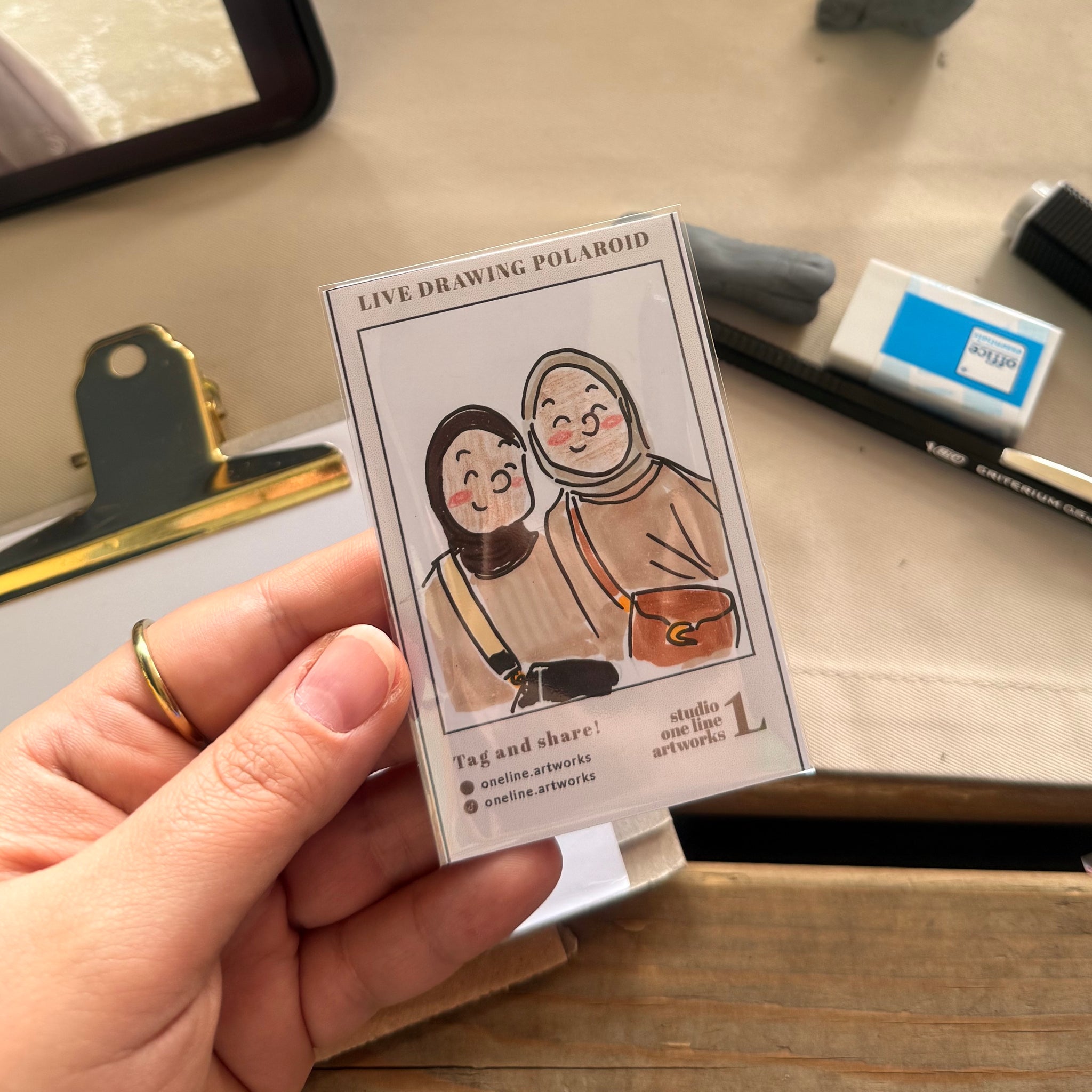 I take a quick reference photo of each guest and create their illustration while they enjoy the event. Within a few minutes, their personalised card is ready to take home — smooth, effortless and beautifully presented.